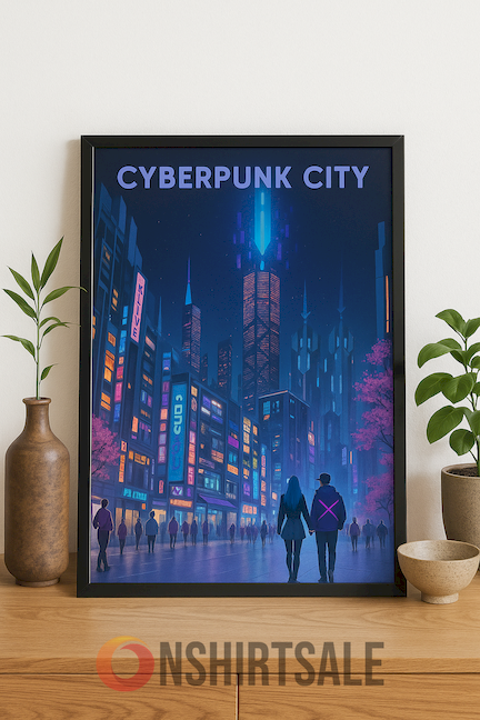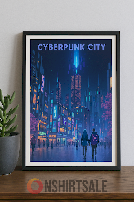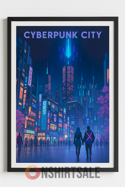 Electrify your decor with a Cyberpunk City Poster featuring neon skyscrapers and a futuristic couple, perfect for sci-fi and urban street art enthusiasts.