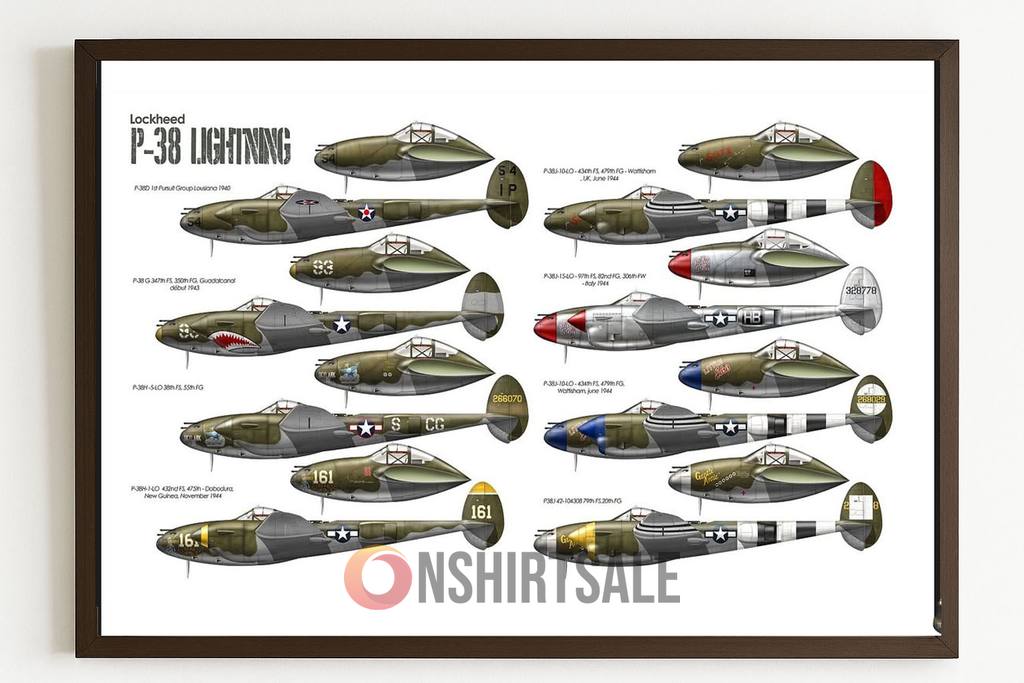 Honor WWII aviation history with this Lockheed P-38 Lightning Aircraft Poster — a detailed fighter plane profile art perfect for pilots, history buffs, and vintage aviation decor.